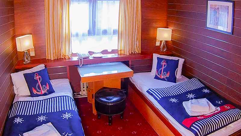 Kahytterne er enten med en dobbeltseng eller to enkeltsenge, brusebad og toilet, satellit-tv og centraltelefon. Der er selvfølgelig også Wi-fi.