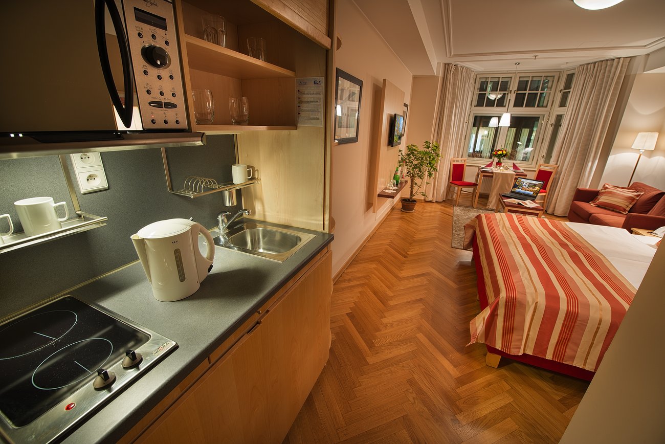 Hotellets rummelige værelser er indrettet med fokus på komfort og funktionalitet. Alle værelser er udstyret med tekøkken, hvilket gør opholdet ekstra bekvemt for både kortere og længere besøg. Derudover tilbyder hotellet: