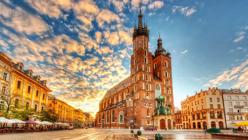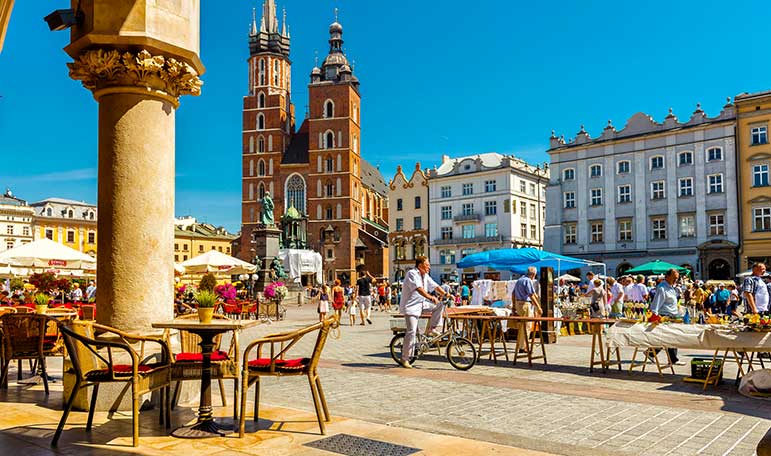 Krakow er en perle af en storby, hvor hver gade emmer af historie og atmosfære. Byen er optaget på UNESCOs Verdensarvsliste og imponerer med sit storslåede torv – Rynek Główny – et af Europas største middelalderpladser. Her mødes du af farverige bygninger, hyggelige caféer og det imponerende Mariakirken med sit karakteristiske tårn og smukke interiør.