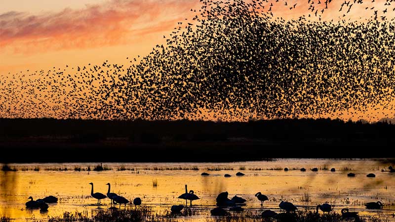 Oplev naturfænomenet Sort Sol, når stære på træk samles i store flokke i Tøndermarsken ved Vesterhavet.
