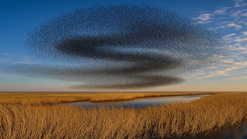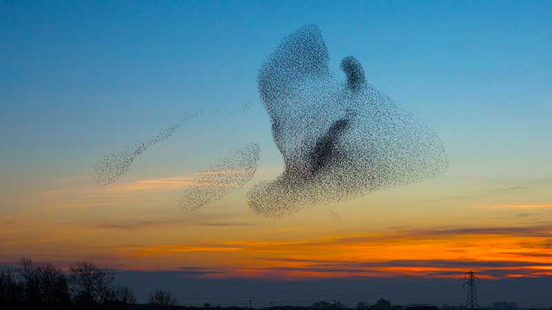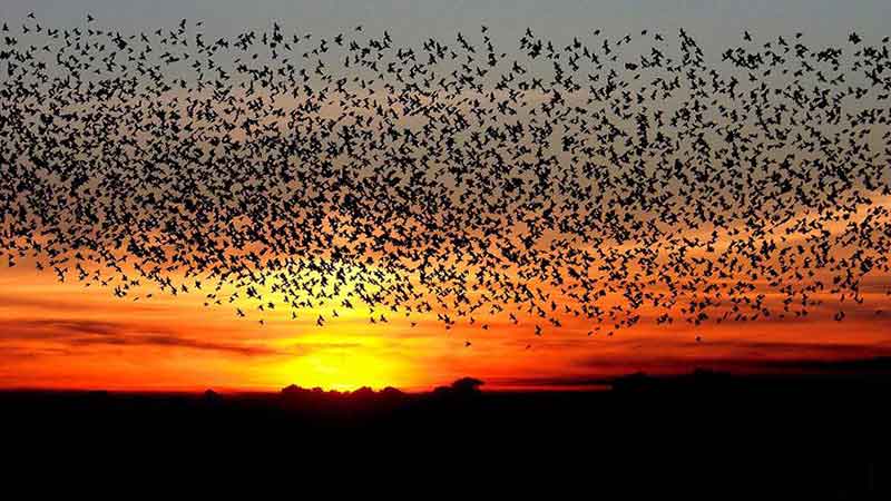 Lige før stærene går ned på jorden for natten, tegner de store flokke fascinerende mønstre på himlen - det kalder man Sort Sol.
